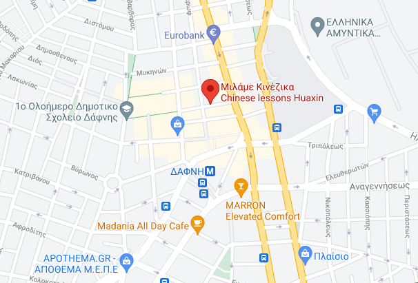 The Huaxin Chinese "MilameKinezika" center is centrally located in the Dafni area, within walking distance of the Dafni Metro. Easily accessible gives the opportunity to all those who are interested in learning the Chinese language and culture to be easily found in our area.